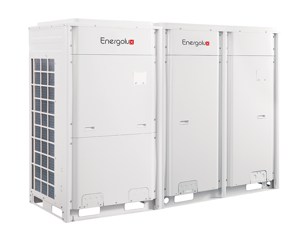 Могут объединяться в единую модульную систему из 4-х наружных блоков создавая систему холодопроизводительностью до 180 кВт.